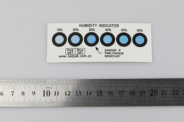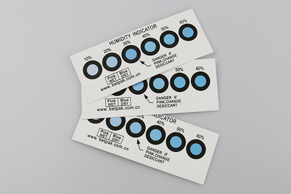 蓝变粉湿度指示卡可以很方便地检测出密闭包装里的相对湿度,是一种便捷而廉价的检测环境中的湿度是安全的方法。使用者可以通过卡片上面的颜色的变化迅速判断产品包装内环境温度情况及干燥剂的使用状况。如果包装中的湿度到了或者曾经到过该湿度值的话,卡片上的点就会从蓝色变成粉红色。可以估算出干燥剂的使用功效,以便及时更换干燥剂。使用BetPak的湿度指示卡产品,可以使您的产品特别是一些精密的产品免去受潮的危险。