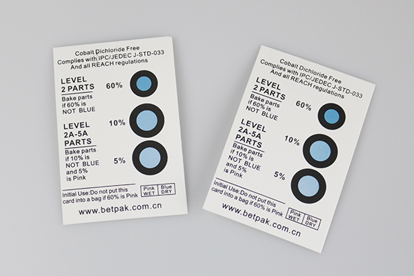 Betpak在原常规蓝变粉湿度卡的基础上,研发出无二氯化钴和无钴无卤素两款更为环保的产品,能更好的满足客户对环境的要求,且提供了多种规格可供选择,有较为常用的30~50%湿度指示及5~15%的湿度指示,也有电子产品专用湿度指示卡及独立指示10~60%湿度指示等。