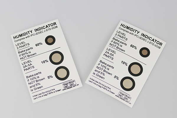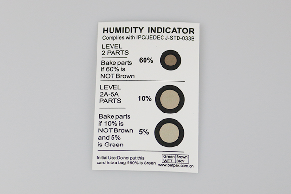 BetPak环保湿度指示卡系列与非环保的规格系列相同,有较为常用的30~50%湿度指示及5~15%的湿度指示,也有电子产品专用湿度指示卡及独立指示10~60%湿度指示等。