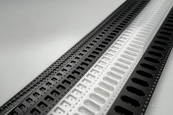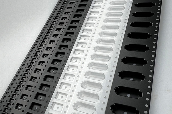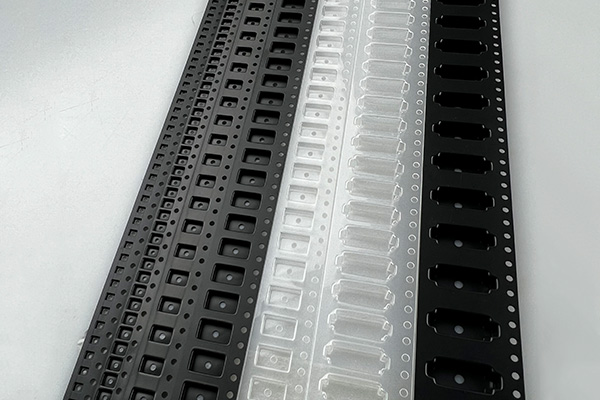 压纹载带(embossed carrier tape)和冲压载带(punched carrier tape)。压纹载带是指通过模具压印或者吸塑的方法使载带材料的局部产生拉伸,形成凹陷形状的口袋,这种载带可以根据具体需要,成型不同大小的口袋以适应所盛放的电子元器件的尺寸;冲压载带是指通过模具冲切形成穿透或半穿透口袋,这种载带能够盛放的电子元器件的厚度受载带本身厚度限制,一般只能用于包装较小的元器件。